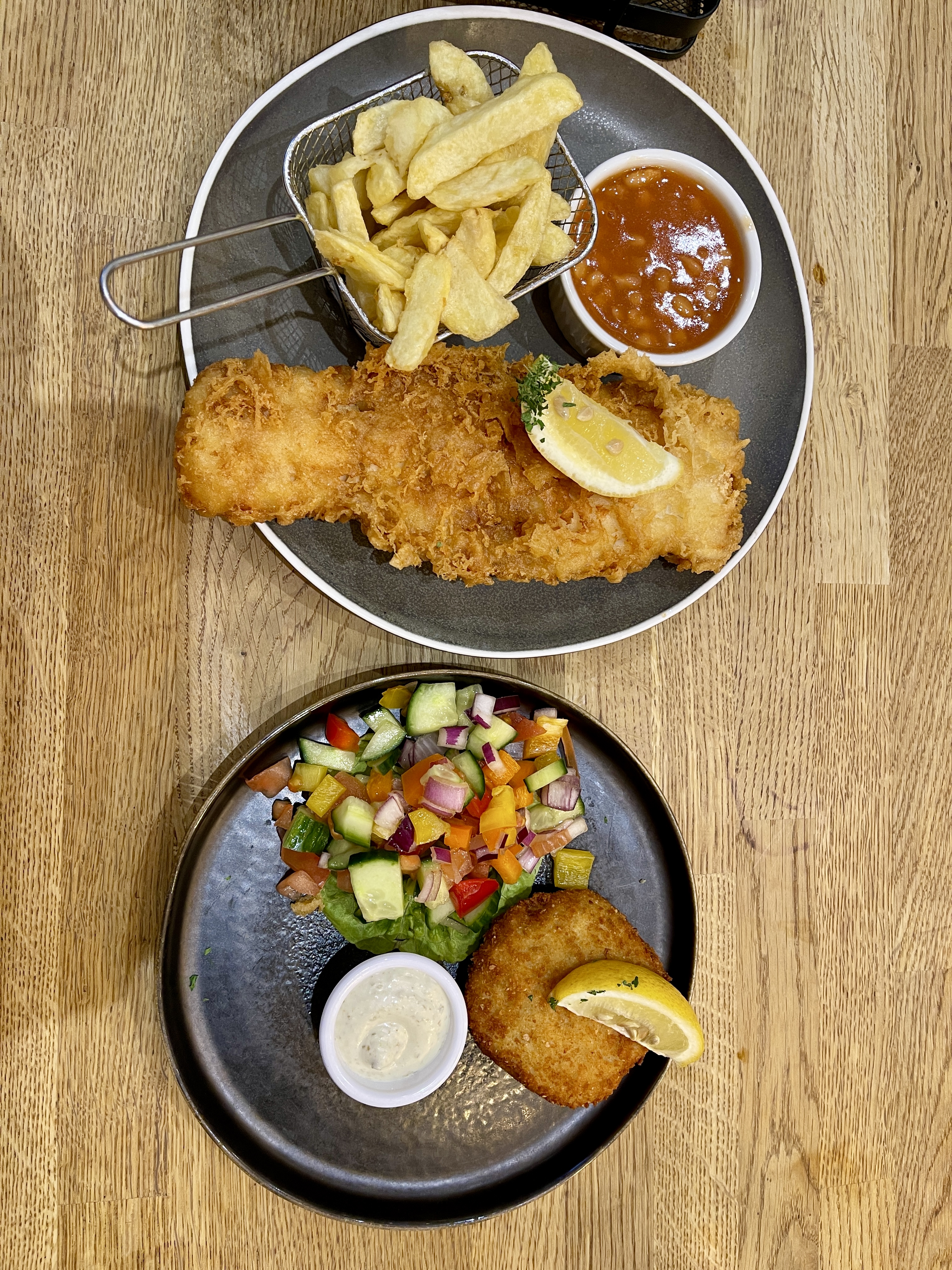 For dinner, we indulged in authentic British fish and chips—crispy, fresh, and absolutely delicious. The friendly waitress even helped us with directions—fantastic service!